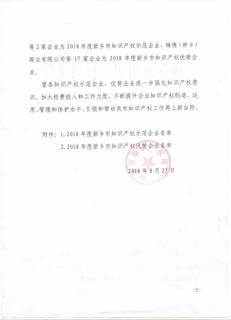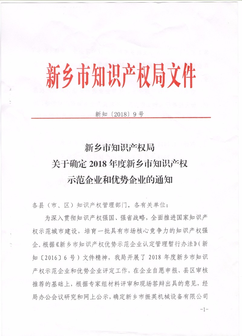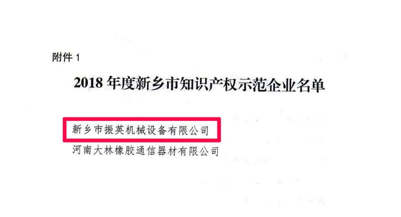 热烈祝贺:新乡市振英机械设备有限公司获得2018年度新乡市知识产权示范企业